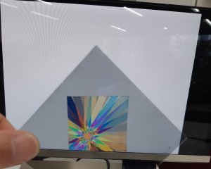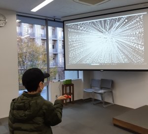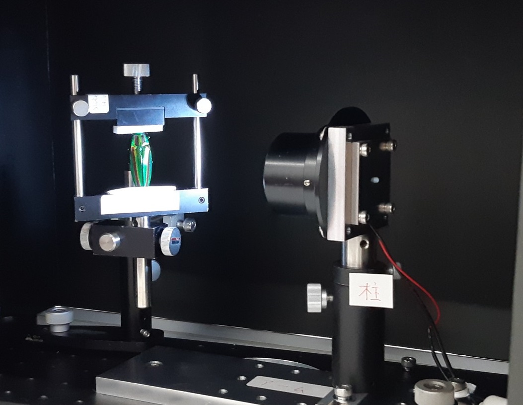 中嶋研究室は人の動きに合わせて映像が変化する「モーションセンサであそんでみよう」、宮島研究室はセロテープの旋光性を使った「テープを使ってにじいろステンドグラスを作ろう!!」と、タマムシの構造色についての説明を行いました。