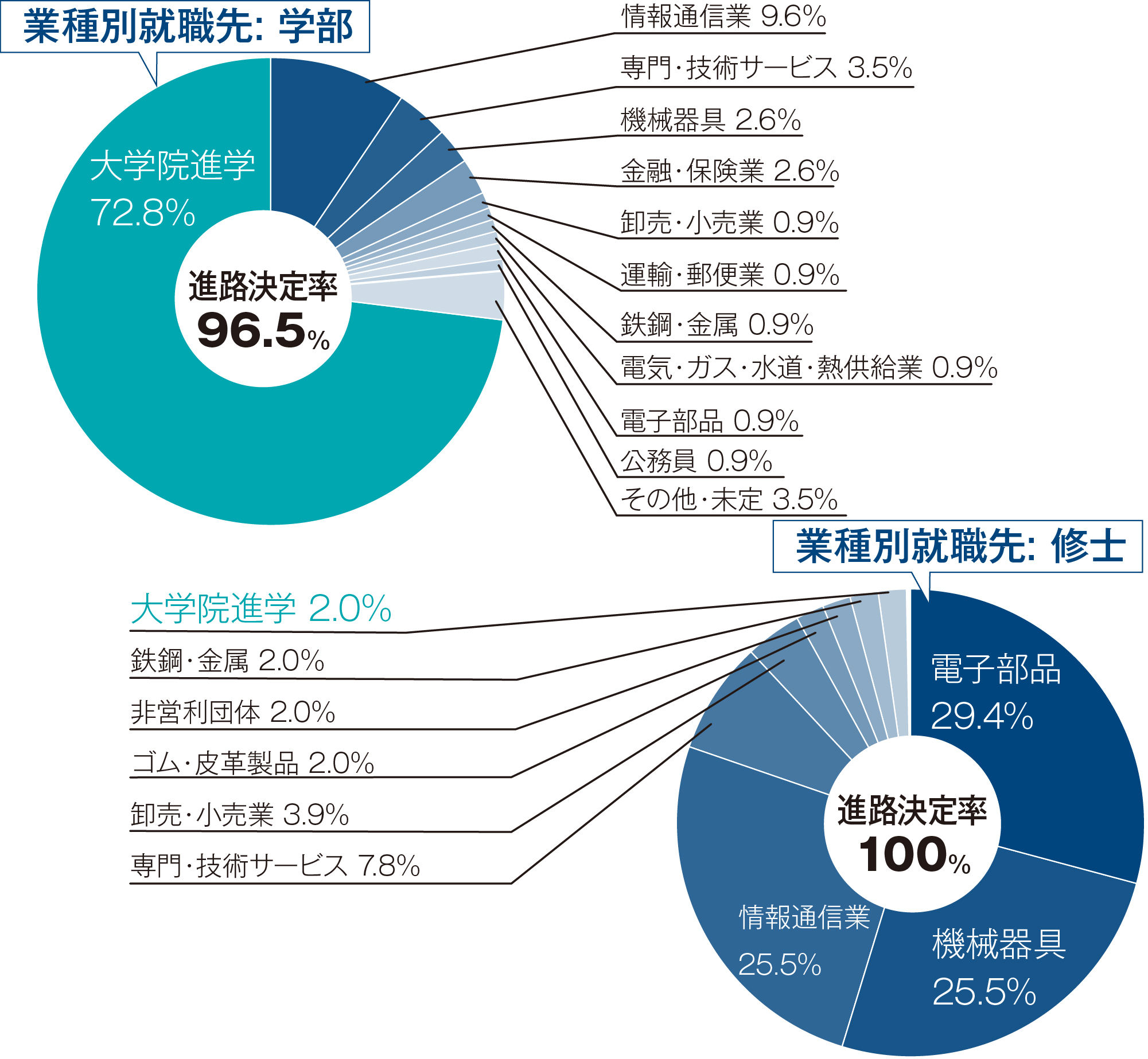 物理工学科で身に付けた方法論はあらゆる分野で通用するため、物理学とテクノロジーの橋渡しができる人材として、広範な分野のメーカーや研究機関、さらにはコンサルティングなどの論理的思考を求められる分野での活躍が期待されます。