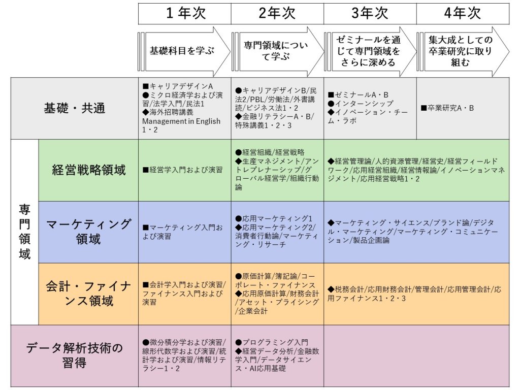 経営問題についてグローバルな視点に立ち、主体的に行動できる人材を育成することを目標としています。経営学の知識の集積にとどまらず、問題を発見・解析して、解決に導くことができる豊かな能力を開発することを目指します。1年次から専門基礎があり、演習による徹底学習を実施。2年次からは経営戦略、マーケティング、会計・ファイナンスなど専門コース別の選択必修が始まります。ケーススタディ、モデル構築、シミュレーションなど実学的アプローチで体験的に学び、ゼミナールと併せて専門分野の研究を深めます。