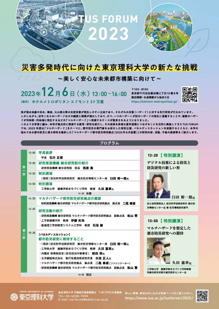 我が国は地震や洪水、津波、火山噴火等の自然災害が発生しやすい立地であり、それぞれの災害(ハザード)に対する先行研究が行われています。しかしながら、近年これらのハザードはその頻度と規模が増大しており、かつ、一つのハザードが別のハザードの発生に連鎖することや、複数のハザードが同時期・同地域に発生するなどの「マルチハザード」へ発展するケースが散見されるようになりました。このような背景に鑑み、本学が重点的に推進する教育・研究を紹介し、その成果を多様な産学連携につなげることを目的に実施してきた TUS FORUMでは、2023年度は「マルチハザード」をテーマに、都市防災の専門家をお招きした特別公演、パネルディスカッションを実施するとともに、本学の強みである都市防災に係る研究を集約した「マルチハザード都市防災研究拠点(2023年8月設置)」の研究内容、活動、今後の展望等をご紹介します。