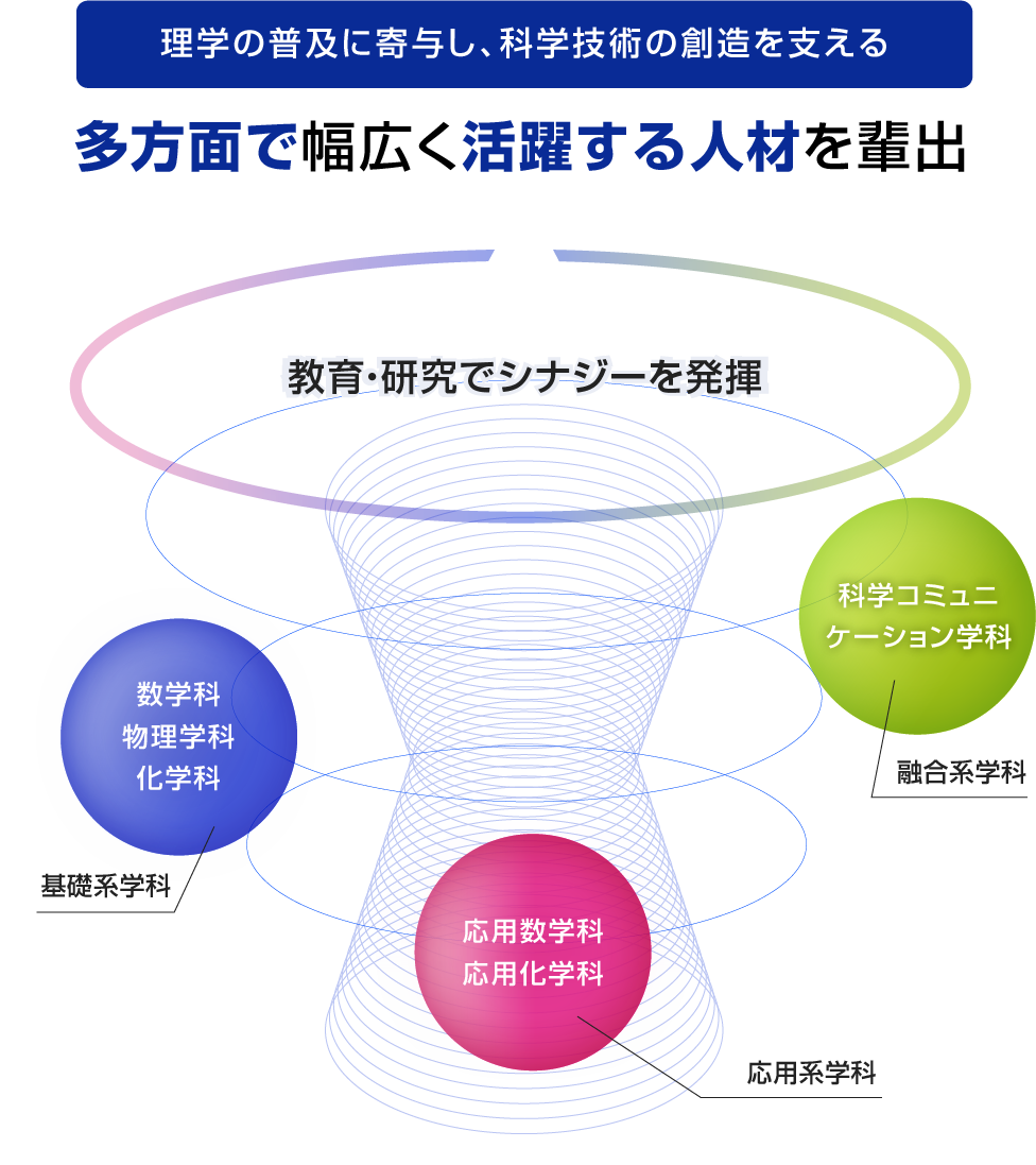 理学は自然界の物質や現象の本質を見極め、その背景にある法則を発見して自然に関する真理を探求する、最もベーシックな学問です。今日、理学は工学や情報科学をはじめとする諸分野に応用され、発展に貢献しています。本学部で学ぶ学問分野は、基礎分野と応用分野がバランスよく配置され、新たに設置される融合系学科を含めて連携を深化することで、教育面・研究面でさらなるシナジーを発揮していきます。本学部から輩出された多くの人材が、科学技術の創造を支える力となり、多方面で幅広く活躍しています。