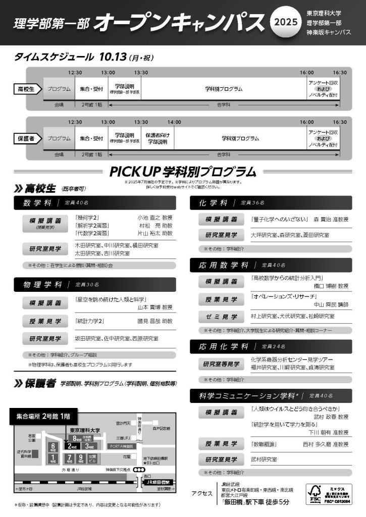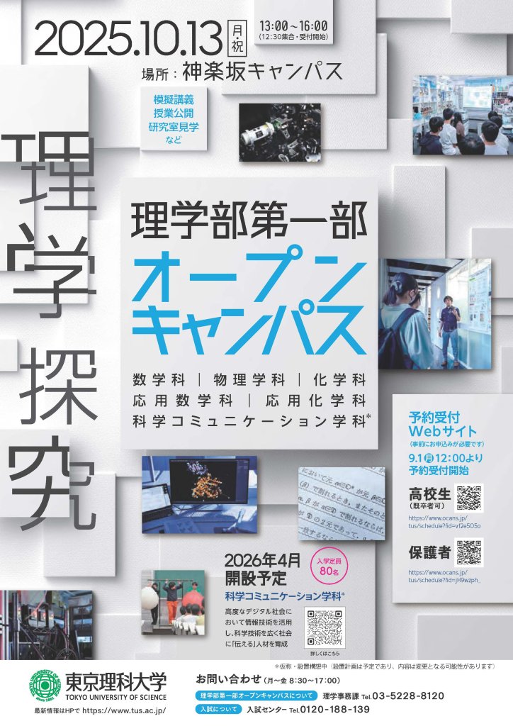理学部第一部では、2025年10月13日(月・祝)に来場型のオープンキャンパスを開催します。