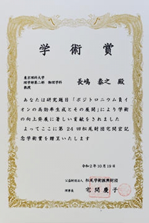長嶋教授の研究室では、電子の反粒子である陽電子が電子2個と束縛したポジトロニウム負イオンの研究で様々な研究を行ってきました。ポジトロニウム負イオンは、質量が等しい粒子からなる、もっとも単純で、しかし極めてエキゾチックな3体束縛状態です。長嶋教授がこれまで行ったポジトロニウム負イオンに関する研究業績に対して、松尾学術賞が授与されました。