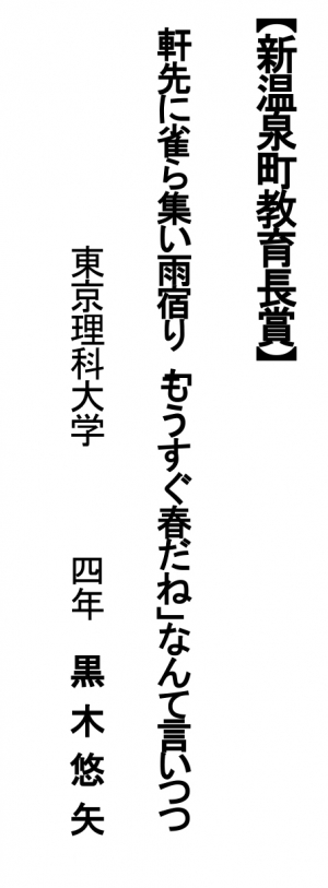 「日本語表現法3(小林真美先生)」を本年度前期に受講し黒木悠矢さんが、新温泉町(兵庫県)・新温泉町教育委員会・神戸新聞社が主催する「「第26回「前田純孝賞」学生短歌コンクール」の〈大学生の部〉において、「新温泉町教育長賞」に入選いたしました。