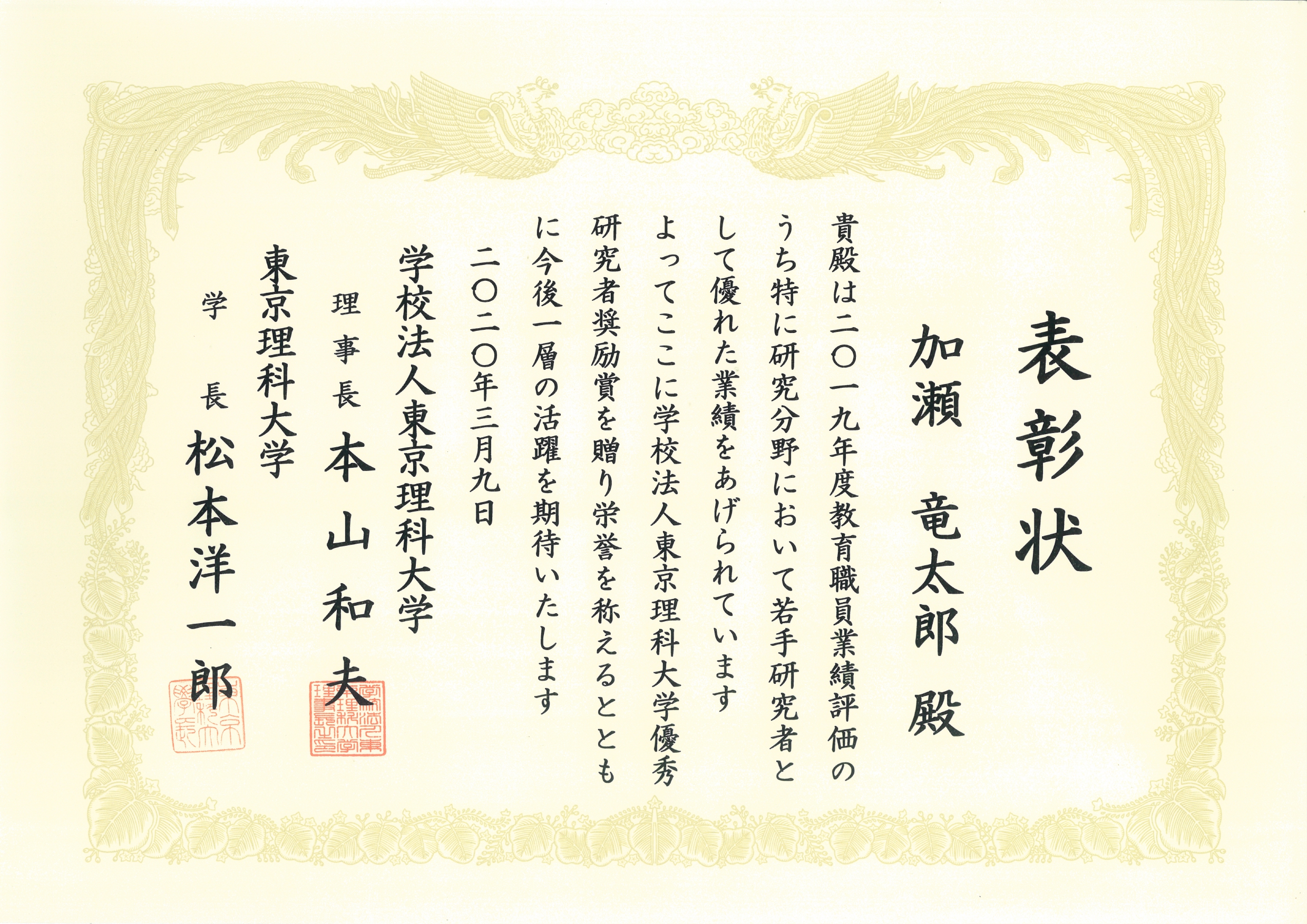 物理学科の加瀬竜太郎先生が東京理科大学優秀研究者奨励賞を受賞されました