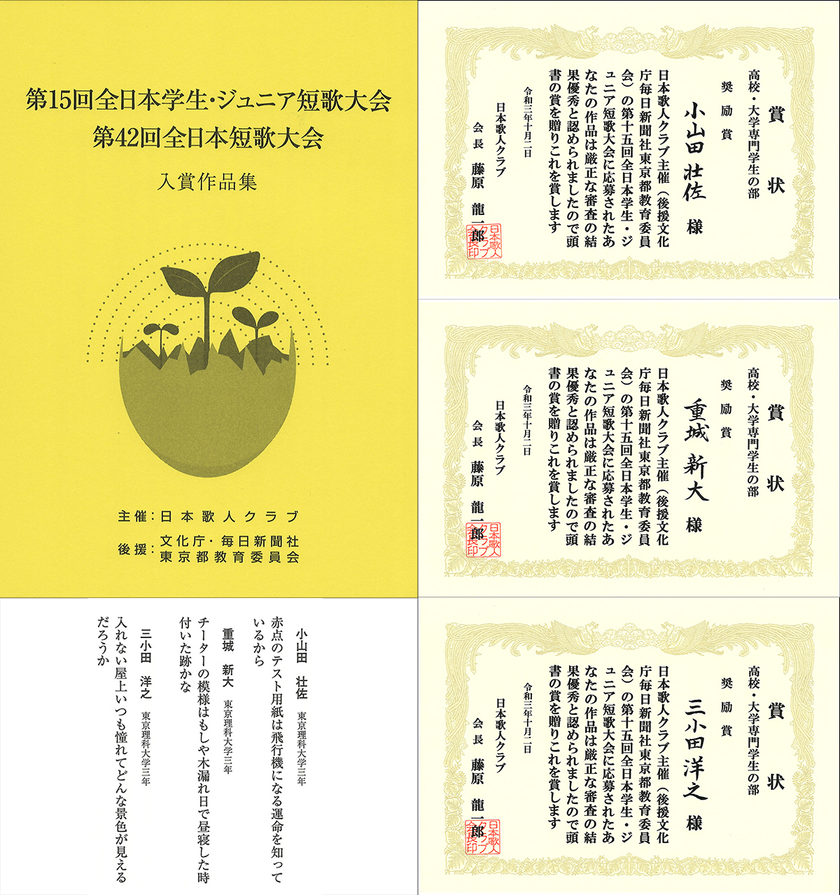 本学理学部第二部数学科三年・小山田壮左さん、同物理学科三年・重城新大さん、理学部第一部応用化学科三年・三小田洋之さんが、 「日本語表現法3」(本年度前期)において創作した短歌が、「第十五回全日本学生・ジュニア短歌大会」の「奨励賞」に入選いたしました。