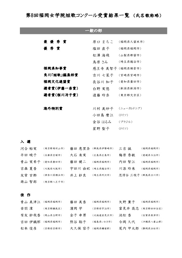 第8回福岡女学院短歌コンクール受賞結果一覧