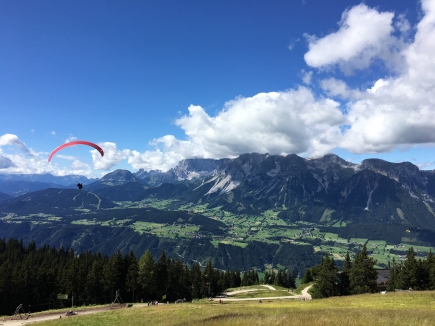 日本の効率の悪さの大きな原因の一つには,無駄にきちっとした書類を揃えることでしょうか.ウィーンでは多くのことは適当に各個人の裁量決まるのでそういった書類も不要で効率がいいのです.休暇も1ヶ月以上を地中海や黒海のビーチや,アルプスなどで過ごし,その原資は会社から休暇手当てとして夏休みとクリスマス休みに支給されるようです.もちろん,数学者や理論物理学者はどこに行っても絶え間なく計算を続けてはいるのですが,それでも,しっかりと家族と過ごす時間があります.現地の先生にお勧めされて訪れたアルプスの写真をご覧下さい.ウィーンから電車で数時間で,このような美しいアルプスの山々とその麓ののどかな酪農地帯に足を運ぶことができます.現地の人たちはこうしたところに何週間と滞在するのです.しっかり働き,全力で休暇を楽しむという,メリハリのある生活.日本人にはなかなか出来ない憧れのライフスタイルですよね.