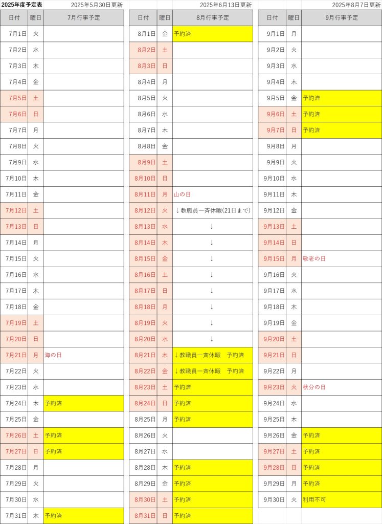 2025年度予約状況 7月~9月