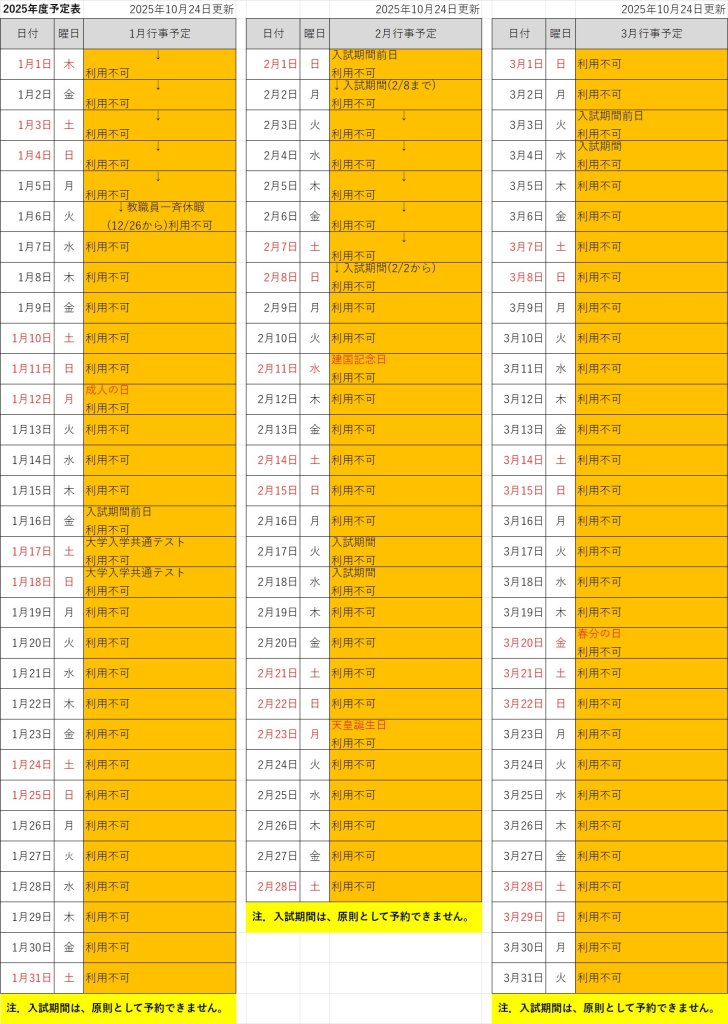 2025年度予約状況 1月~3月