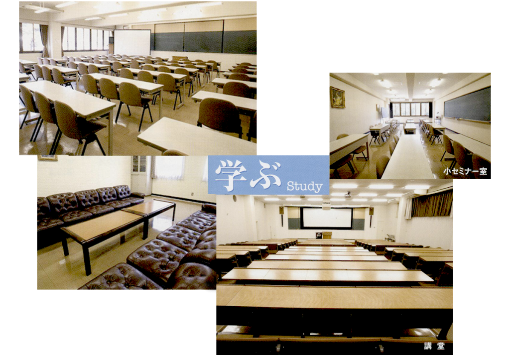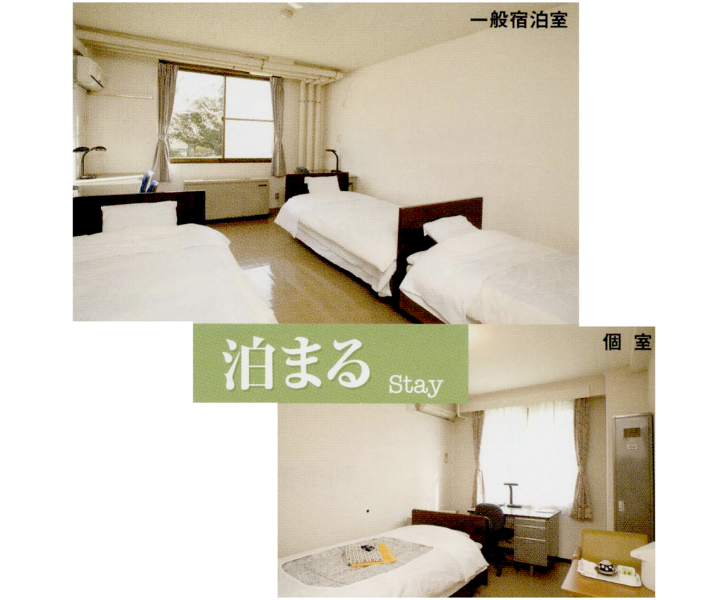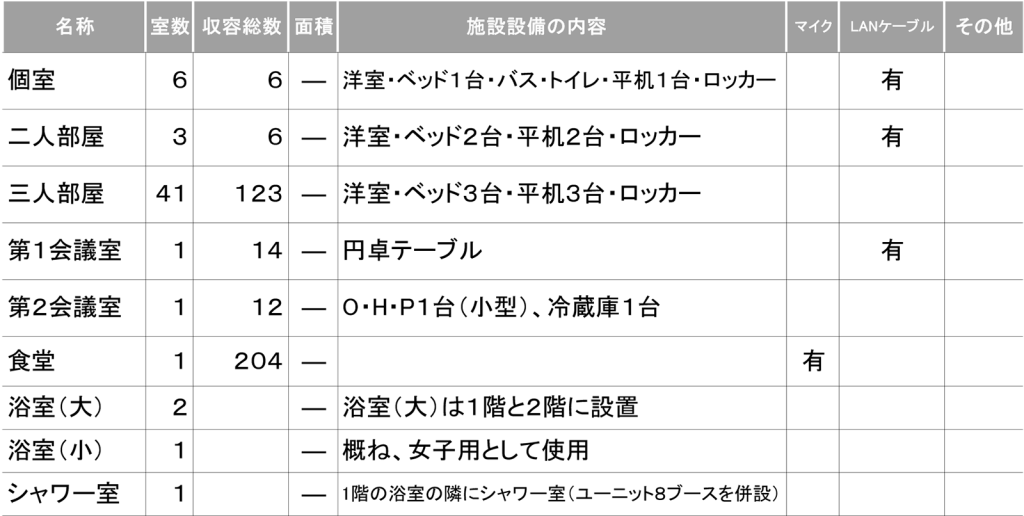 ※ セミナーハウス宿泊棟の宿泊室総数は50室です。1階は二人部屋1室、三人部屋18室、2階は個室6室、二人部屋2室、三人部屋23室からなっています。個室と二人部屋は教職員用です。三人部屋は学生用で123名の収容となっています。