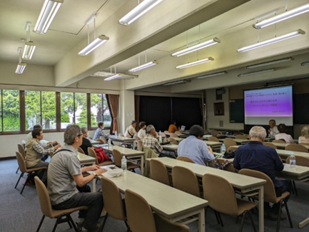 始めに、セミナーハウス第1ゼミ室において、新保氏より、理窓公園の歴史や開設理念*、利根運河を挟んで理窓公園の対岸にある流山市東深井地区公園(古墳の森)との利根運河開削前の水系(東深井谷津)を共有する位置関係、東深井地区公園の2023年における、きんらん(327株/ha)、ぎんらん、ささばぎんらんの30日間にわたる開花数推移、こうのとりが2024年4月23日に飛来した理窓公園内の蓮池についてのミニ講義がありました。