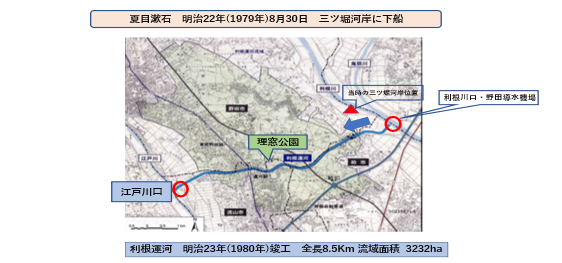 このミニ講義の中では、明治23年(1890年)竣工前の利根運河を夏目漱石が数え22歳の時に、房州旅行の銚子からの帰路、三ツ堀河岸(野田市)に8月30日早朝に下船し、陸路を歩き、利根運河の江戸川筋の今上河岸(野田市)から汽船に乗って東京に戻っていることにも触れられ、参加者は、本学と夏目漱石の縁を感じながら、興味深く、新たな知見として聴講しました。