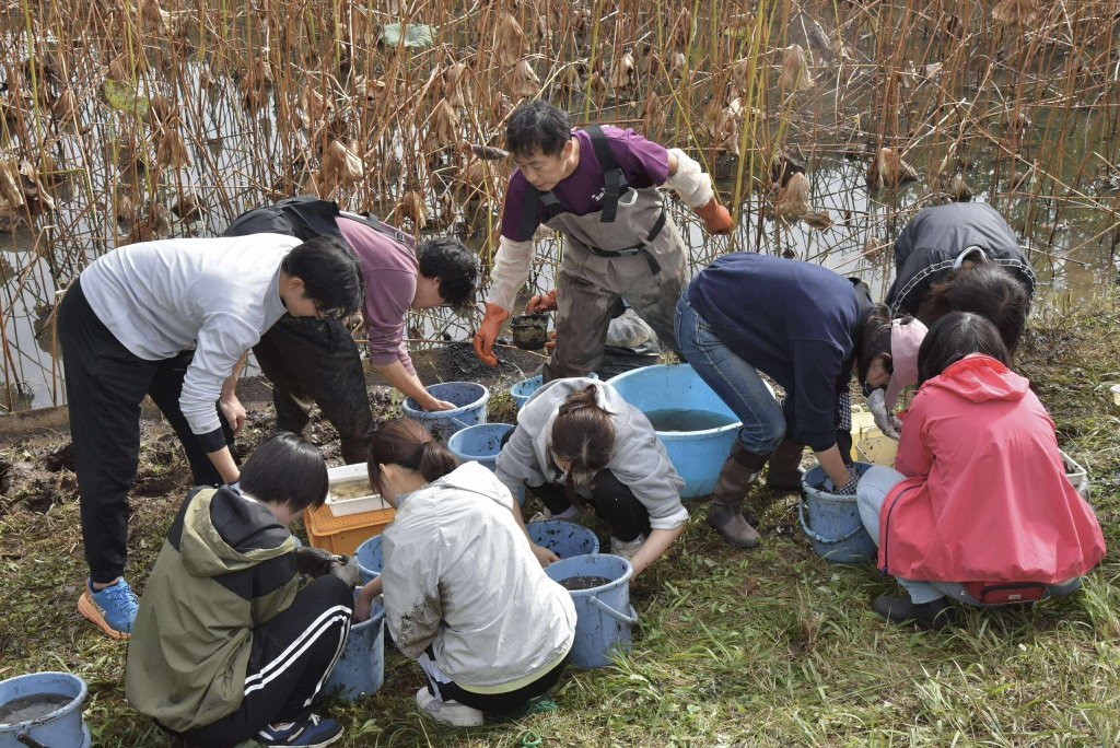 当日は主催したNPO法人生態工房に関係するボランティア及び本学の学生、教職員有志団体理窓公園応援隊、さらに近隣の子供たち総勢約100人が参加し、胴長靴をはいて池に入りタモ網で外来種の魚類などを捕獲しました。