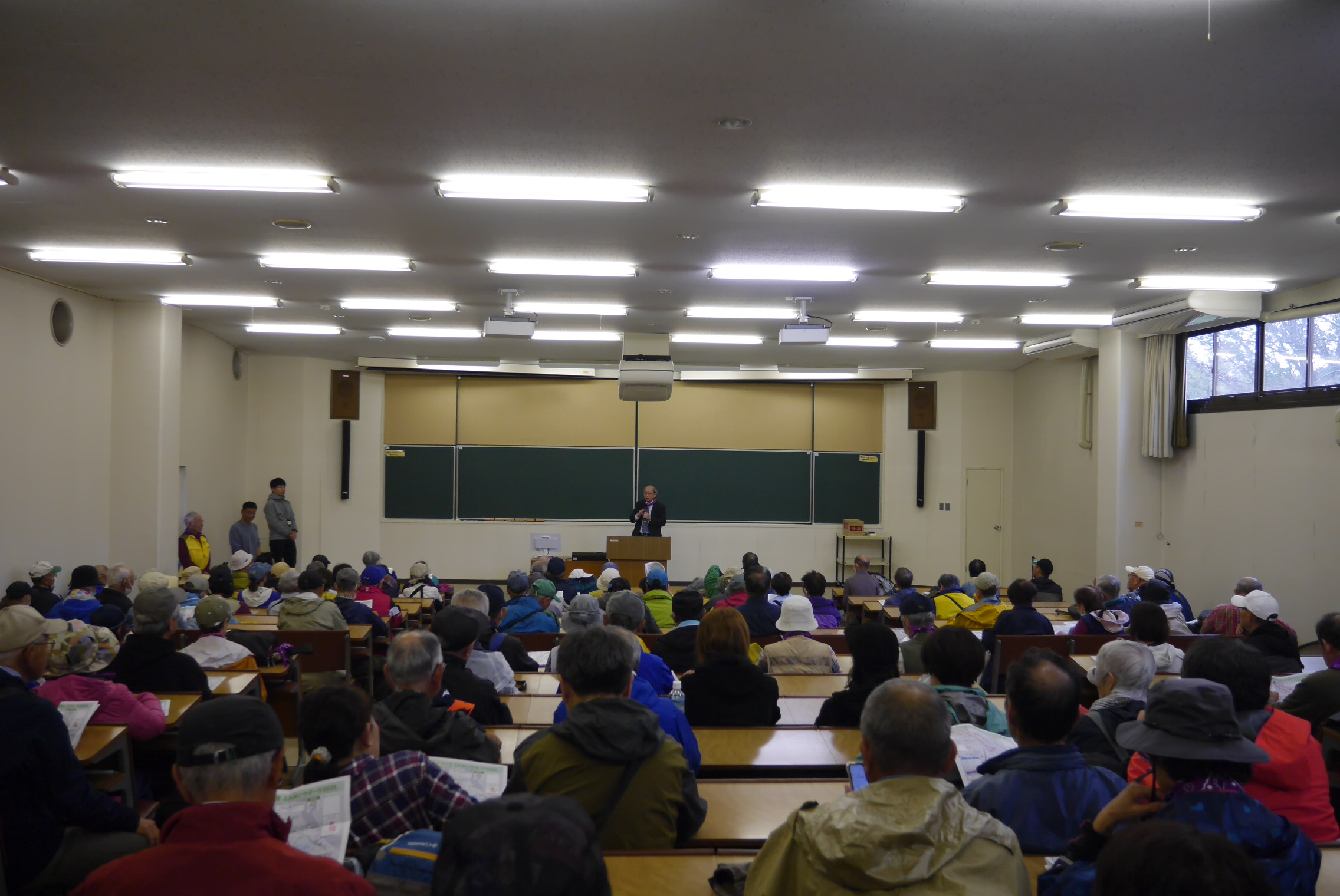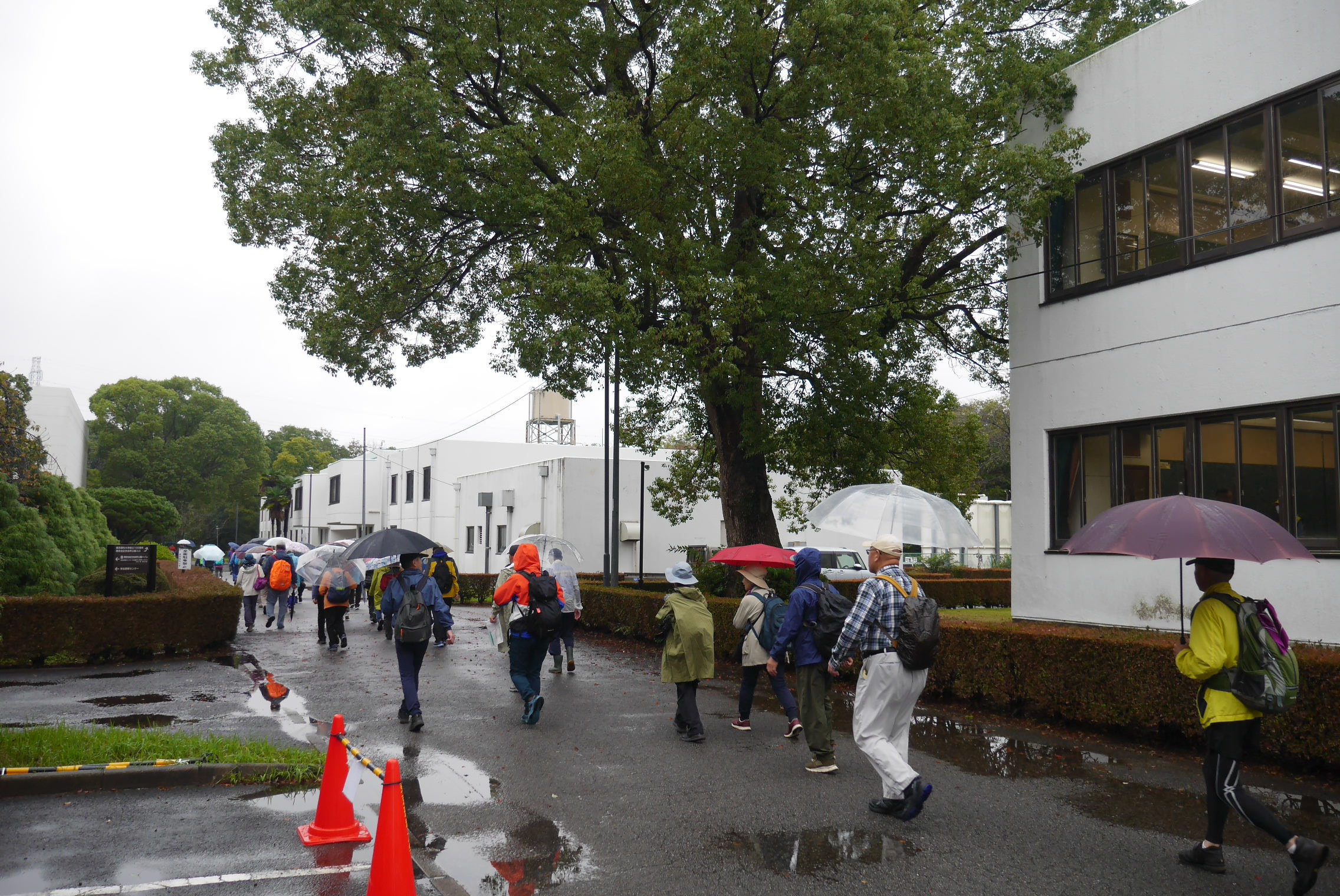 あいにくの天候のため、出発式は室内で実施。宇田川克巳 野田市自然経済推進部長、兵庫明 学校法人東京理科大学常務理事、伊藤隆之 NPO 法人千葉県ウオーキング協会会長から挨拶があり、小雨のなか、参加者は完歩に向けて出発しました。