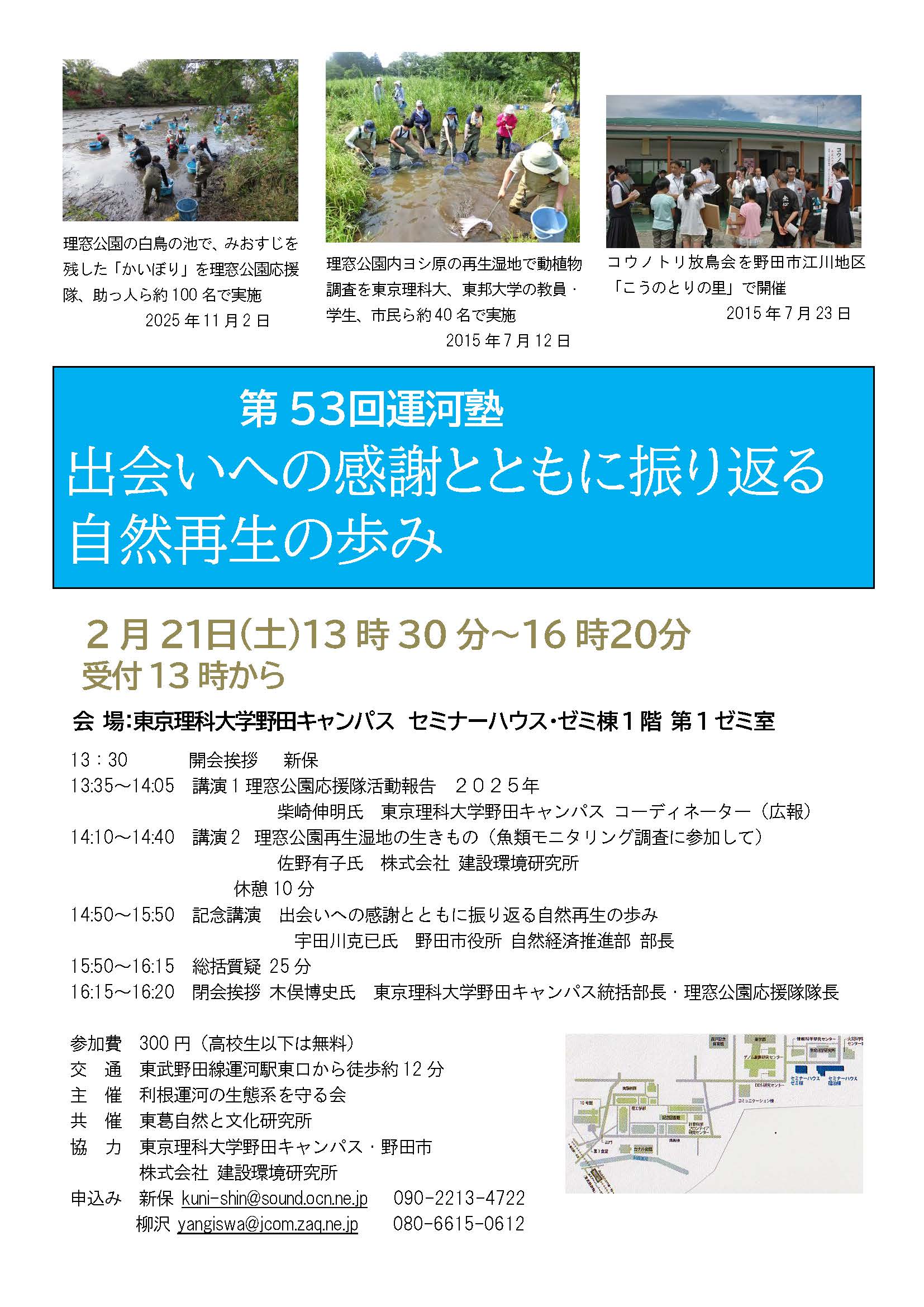 第53回 運河塾開催のお知らせ 2025年12月22日 2025年12月24日 e96x5g4t 恒例となりました「利根運河の生態系を守る会」主催による運河塾を開催します。今回の主題は、野田市役所自然経済推進部 部長 宇田川 克己氏 による「出会いへの感謝とともに振り返る自然再生への歩み」を予定しています。 日 時 2026年2月21日(土) 13:30~16:20 場 所 東京理科大学野田キャンパス セミナーハウス 第1ゼミ室 参加費 300円(高校生以下は無料) 申込み等、詳細につきましては添付のチラシをご覧ください。