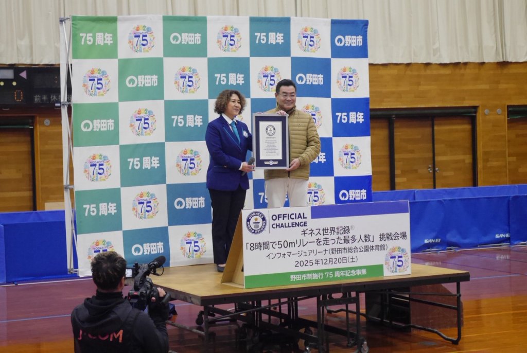 2025年12月20日(土)に開催された、野田市主催のギネス世界記録「8時間で50mリレーを走った最多人数」に協賛しました。本学からは大学オリジナルラベルのミネラルウォーターを提供し、走り終えたランナーへ配布しました。