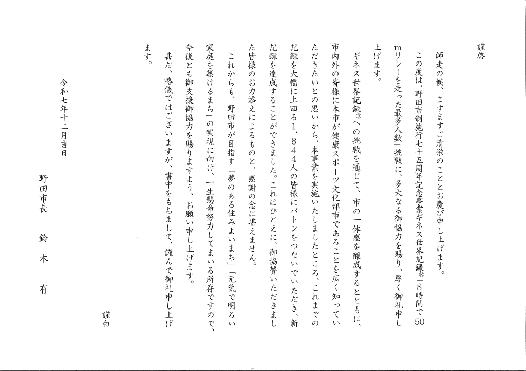 本学からは学生、教職員10数人が参加し、記録達成に向けてバトンをつなぎました。最終的には1,844人が走り、みごと新記録を達成!ギネス世界記録公式記録員から鈴木市長に公式認定証が授与されました。