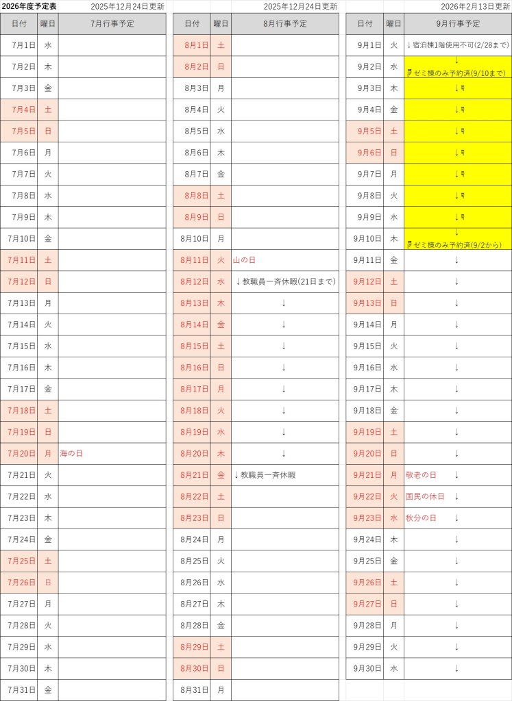 2026年度予約状況 7月~9月