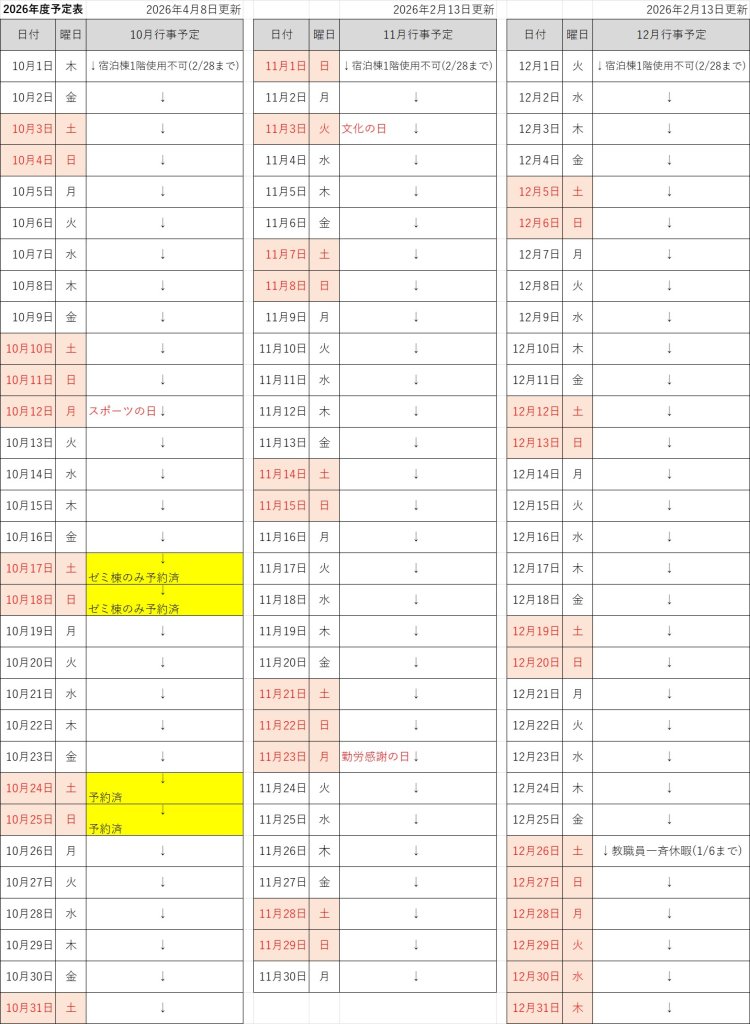 2026年度予約状況 10月~12月