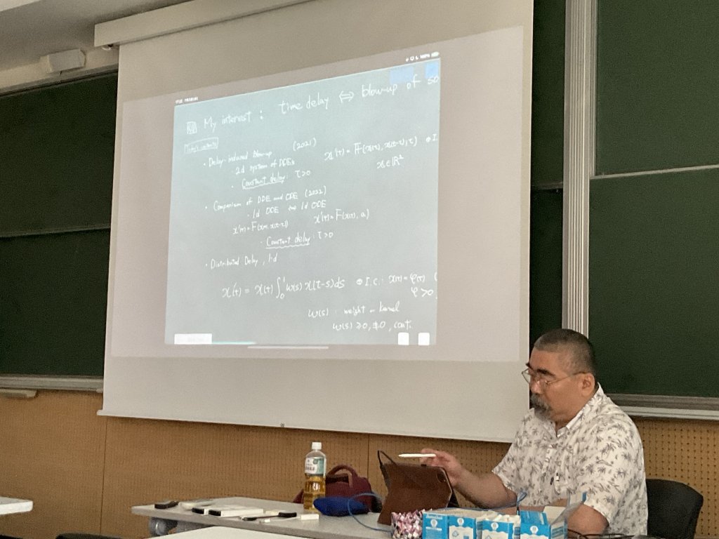 概要 | 時間遅れはシステムに振動性・不安定化をもたらせることもあるし、不安定 な解軌道を時間遅れを含む制御をいれることにより安定化させることができることもあ り、システムの”安定性”という観点からはいろいろな側面をもつ。ここでは解の爆発とい う観点から時間遅れの効果について考察した結果を紹介する。前半では、2次元の遅延微 分方程式系に対する時間遅れが誘導する解の爆発現象などを紹介する。後半では 1 次元の 遅延微分方程式をあつかい、定数遅れの場合と分布型遅れの場合について最近考察して いる内容について紹介する。本研究は、主に中田行彦氏(青山学院大学)との共同研究で ある。 |