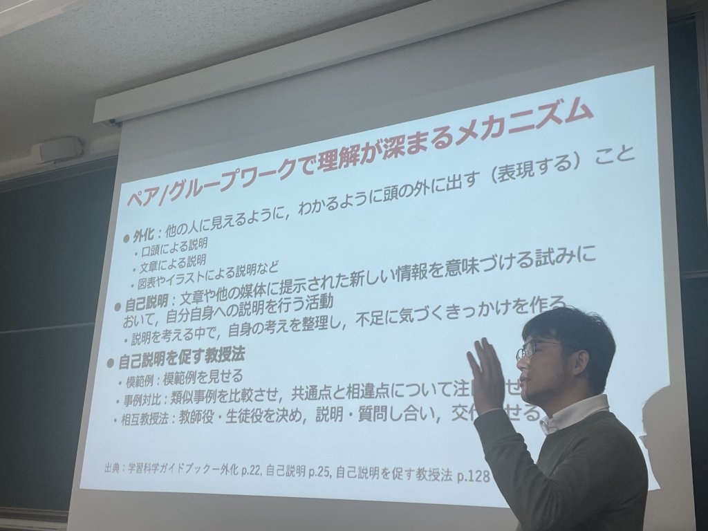 概要 | 大学における授業でアクティブラーニングが必要とされている.アクティブラーニング型の授業の教育効果が従来の講義型の授業に比べて高いことが示されている一方で,既存の知識や考え方を教授する講義に加えて学生同士で取り組むグループワークの時間を十分に確保することは容易ではない.この問題にアプローチする1つの方法が教室授業とオンライン学習と組み合わせるブレンド型授業である.講義を動画で授業前に視聴させ,授業時間内では演習を中心に行う反転授業など,授業時間外のオンライン学習を授業設計に含めることで学習効果が高まることが示されている.本発表では,アクティブラーニング型授業設計の要点,ブレンド型授業の設計パターンについて紹介するとともに,コロナ禍を経て普及しつつあるハイブリッド型授業についても触れる. |