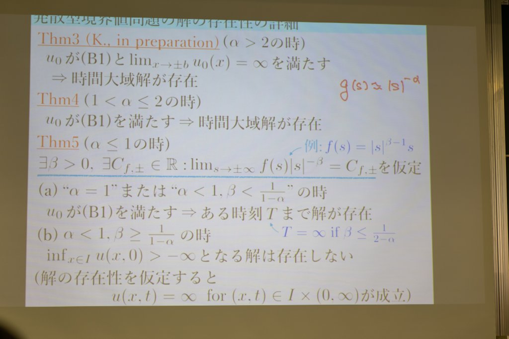 | 概要 | 本講演では,2階完全非線形放物型方程式に対する発散型境界値問題について論ずる.一般的なノイマン条件は,例えば管の中の液体界面上昇現象の解析を動機とした,接触角条件として導入された.発散型ノイマン境界条件は,接的な角度条件に対応する.また,発散型ディリクレ境界値問題は,非有界な曲線流のグラフ解の方程式の一般化としても解釈できる.一方,発散型境界条件は,Lasry-Lions (1989)によって定常問題の可解性について研究され,その可解性は内部方程式の形に依存することが解明された.本講演では,時間発展問題の一つである放物型方程式を対象とし,初期値問題の解の存在性・非存在性が内部方程式のある条件に依存することを中心に研究成果を紹介する.なお,本講演の内容は,柳青氏(沖縄科学技術大学院大学)との共同研究の成果を含む. |