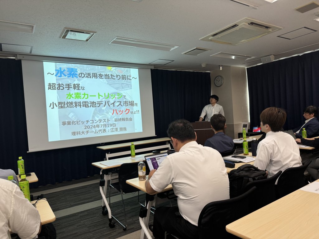 2024年7月19日にコンフォート水道橋(東京都千代田区)にて、電気化学会事業創出ピッチコンテスト(主催:公益社団法人電気化学会,協力:ユニバーサルマテリアルズインキュベーター(UMI)株式会社)が行われ、創域理工学研究科で実施している横断型コース(エネルギー・環境コース)での共響(きょうめい)研究活動の1つであるグリーン水素を利用した燃料電池アシスト自転車の技術開発について事業提案を行いました。