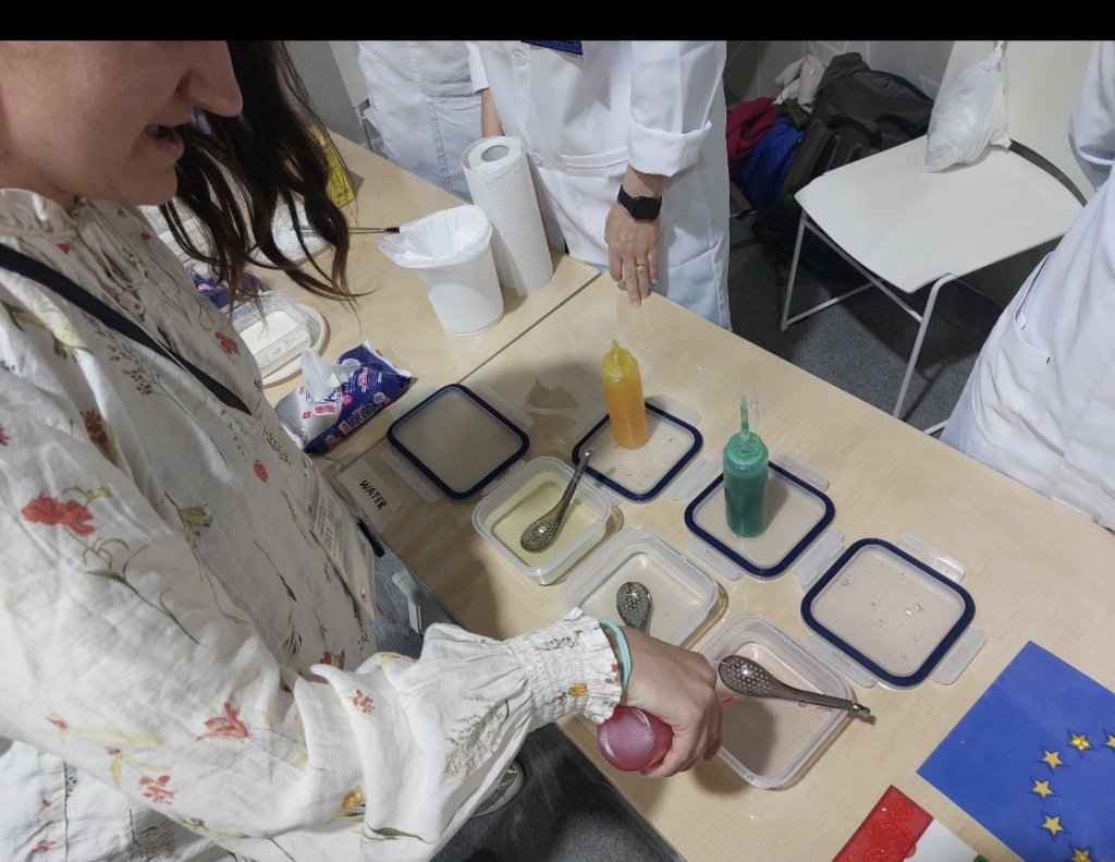 こちらのプロジェクトでは、フィレンツェ大学のピエロ・バリオーニ名誉教授、資生堂の小倉卓氏、本学先端化学科の四反田功准教授が連携して、絵画修復に関する保護膜の適切な除去に関する新規評価法を開発しています。その研究開発技術を活かし、本展示では、絵画修復に用いられるマイクロエマルション技術ならびに、それを含むゲルを用いた絵画修復についての体験を実施しました。