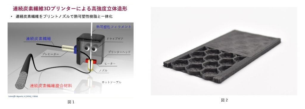 私たちは、連続炭素繊維複合材料と呼ばれる複合材料を利用した3Dプリントの方法を開発しています。この方法ではまず、長く連なった炭素繊維(=連続炭素繊維)を、3Dプリンターに入れて熱可塑性樹脂(=熱によって柔らかくなる樹脂)と一体化させて、細い糸状の複合材料(=連続炭素繊維複合材料)を作ります(図1)。それをデータに基づいてケーブルを敷くように置いていくことで、目的の形状にしていきます。