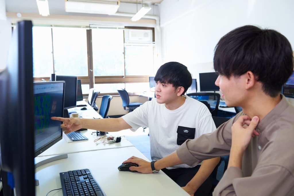 大部分の学生が、いまお話した複合材料の3Dプリンティングに関わる研究をやっていて、その中の複数の学生が取り組んでいるのが、3Dプリンターそのものを作ることです。プリンターをゼロから作ってる学生もいれば、市販の樹脂系の3Dプリンターを買って、そのヘッド(樹脂などを出力する部分)を自分たちで改造して、連続炭素繊維複合材料を扱えるようにすることを試みている学生もいます。また一方、複合材料を3Dプリントするにあたって、どのように設計するとよいか、つまり、炭素繊維をどのように配置すると有用なものが作れるかを考え、シミュレーションを行っている学生もいます。