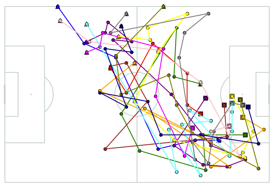 先ほどは、発注から納品までの流れを一つのプロセスとして考えましたが、これをサッカーに置き換えて、チームがボールを持ってから一連の攻撃が終わるまで、つまり、ポゼッションの始まりから終わりまでを一つのプロセスとして考えます。すると例えば、スローインからプロセスが始まった場合、パスをつないでドリブルしてシュートを打って終わる場合や、パスをつないでいった結果、相手にボールを取られてしまう場合など、様々なパターンがあります。そのように、ピッチ上でボールがどう動いたかというプロセスを、まずは特徴によってグループ分けします。
