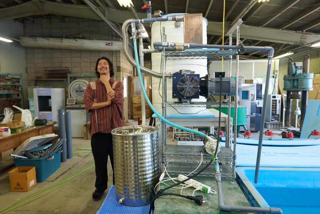 温泉の濃縮とは、基本的には、温泉の水分を飛ばして成分だけを抽出するということで、その過程で主に起きているのは、水が液体から気体になるという単純な状態変化です。込み入った電気化学的な変化が起きているわけではありません。ただ、ビジネスとして成り立たせるためには効率が重要です。大きな装置を使えば熱効率が上がるので、大きな温泉地ではすでに行われていますが、私たちは、これを小さな装置でも効率よくできるようにすることを目指して技術開発を進めています。つまり、熱力学、熱工学的な側面が強い物理学的な研究です。近年経営が大変になっている小規模な温泉地で、自分たちの技術や知見を活かせてもらえたらと思い、こうした研究にも取り組んでいます。