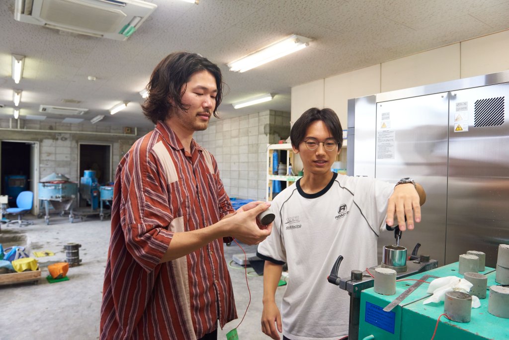 そして最後が、カーボンニュートラルに寄与する建材開発の研究です。これは私の学生時代の指導教官である加藤佳孝先生(社会基盤工学科 教授)との共同研究で、植物の主要な成分であるセルロースと、鉄を作る時に生じる副産物(カルシウムシリカ系の物質)とを混ぜ合わせて、セメントを代替する材料を作ることを目指しています。セメントはその製造過程で大量の二酸化炭素を排出することが問題とされているのですが、この代替材は、木から得たセルロースを主成分とするため、大気中の二酸化炭素の固定に貢献します。というのは、セルロースに含まれる炭素は、もともと大気中にあった二酸化炭素を木が光合成で取り入れた結果のものなので、それを建材として利用できれば、建物の中に大気中の二酸化炭素を固定できることになるからです。ただ、十分な強度(圧縮強度)を得るために材料をどう配合すれば最適なのかがはっきりと見えてこず、これも今、研究を進めているところです。なかなか難しいのですが、やりがいのある研究だと思っています。