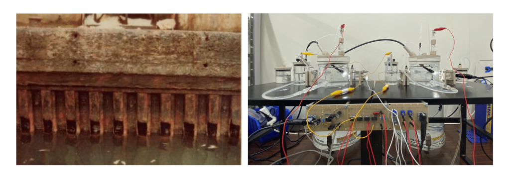 腐食は酸化反応(=鉄が電子を失って酸化鉄になる)のため、ある場所で腐食が起きていれば、どこか別の場所で、電子の収支を±0とする還元反応が起きていると考えられます。しかし、どこでどのような還元反応が起きているのかがわかっていません。それを解明するための実験を行おうとしているのですが、同じ海の中の異なる場所で酸化反応と還元反応が別々に起きている状態を実験で再現するには、同じビーカーの中で、酸素が多い部分と酸素が少ない部分を作るといったような、溶液の偏りを作らなければならず、それはとても困難です。そこで私たちは、独立した2つのビーカーそれぞれの中で酸化反応と還元反応が起こるようにしながらも、センサー、電極などを駆使した電子回路を活用して、両者が疑似的に同じビーカーの中であるような状態を作ることを試みています。いま、研究室の大学院生が、試行錯誤しながらこのような実験系を作ってくれている段階です。