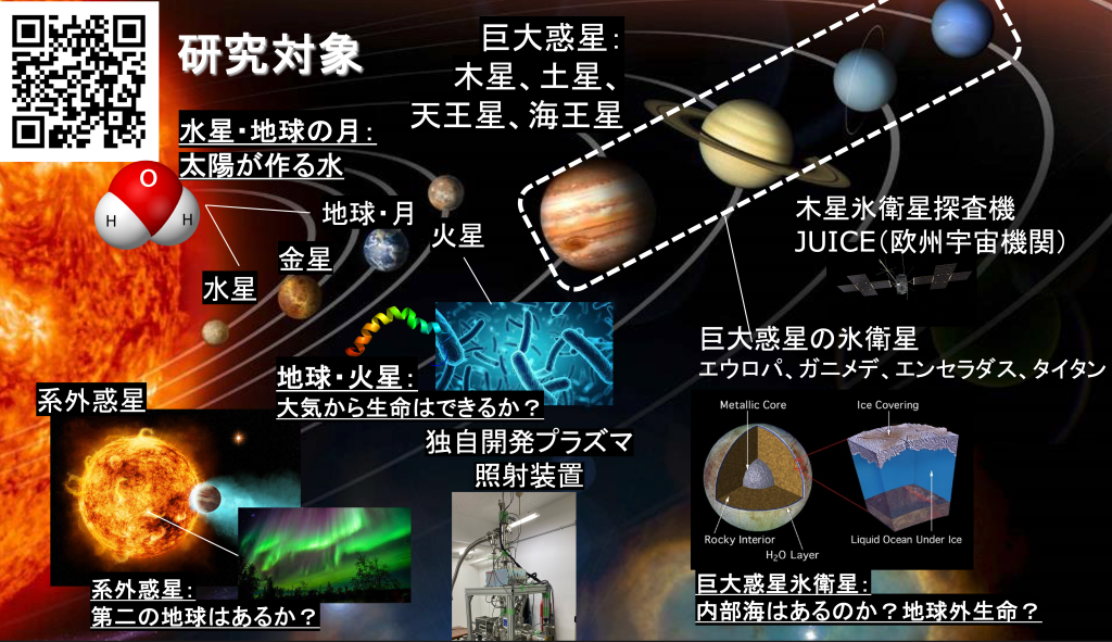 • 氷衛星の生命環境:プラズマ照射実験により、氷衛星の内部海から噴出した物質の表層での変性を模擬し、氷衛星の内部海の進化や組成を解明して、生命存在可能性を検証する。